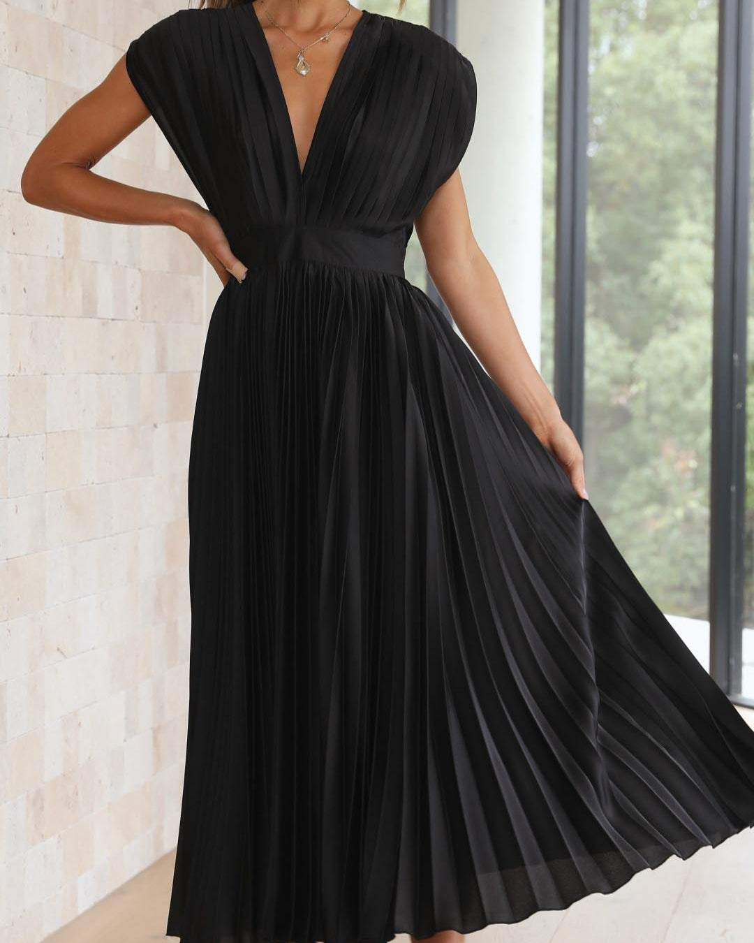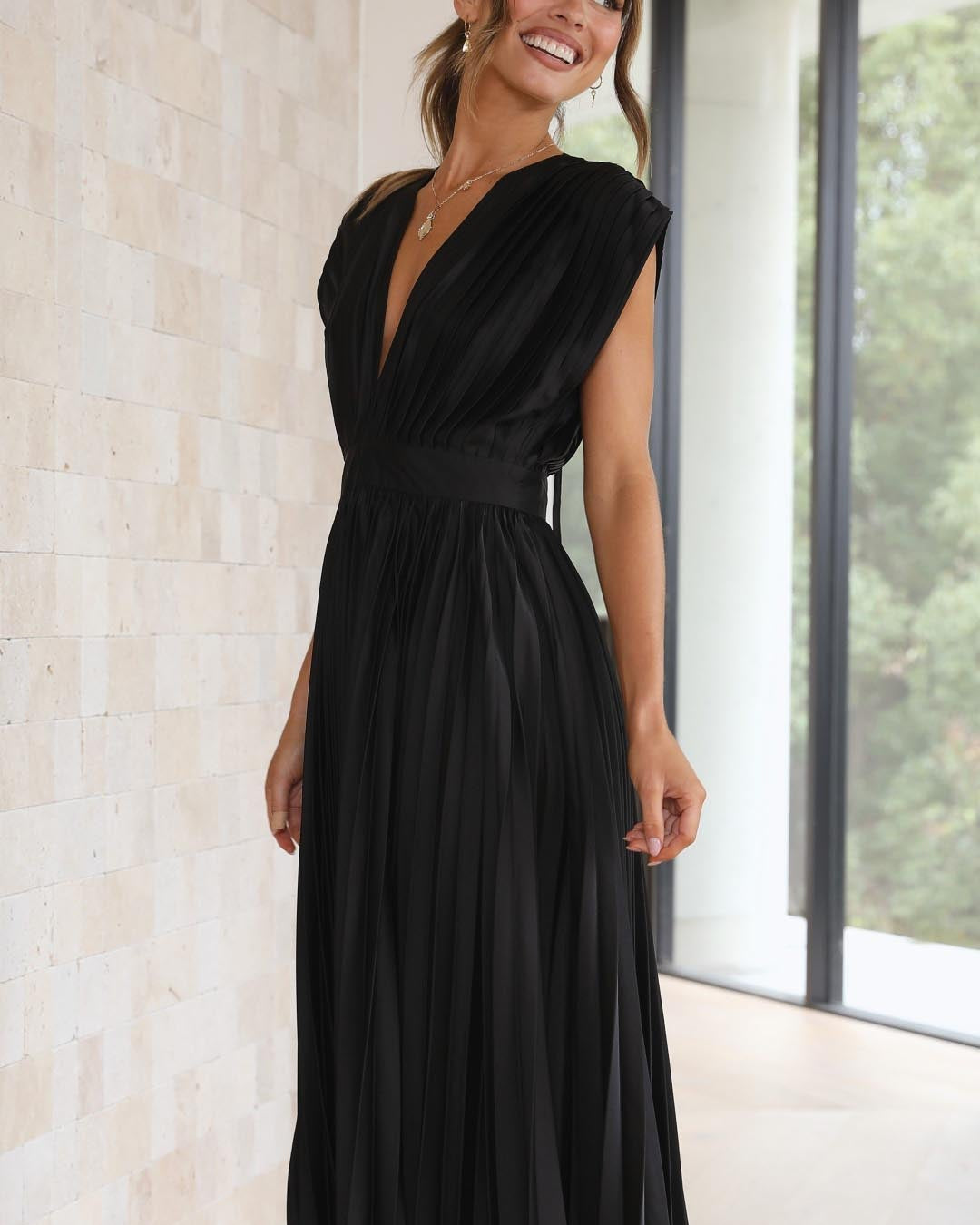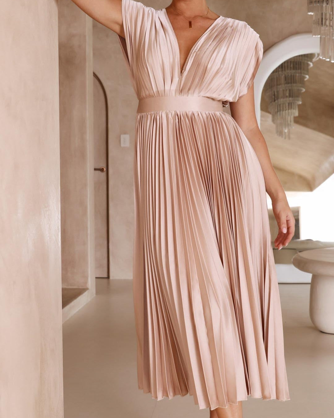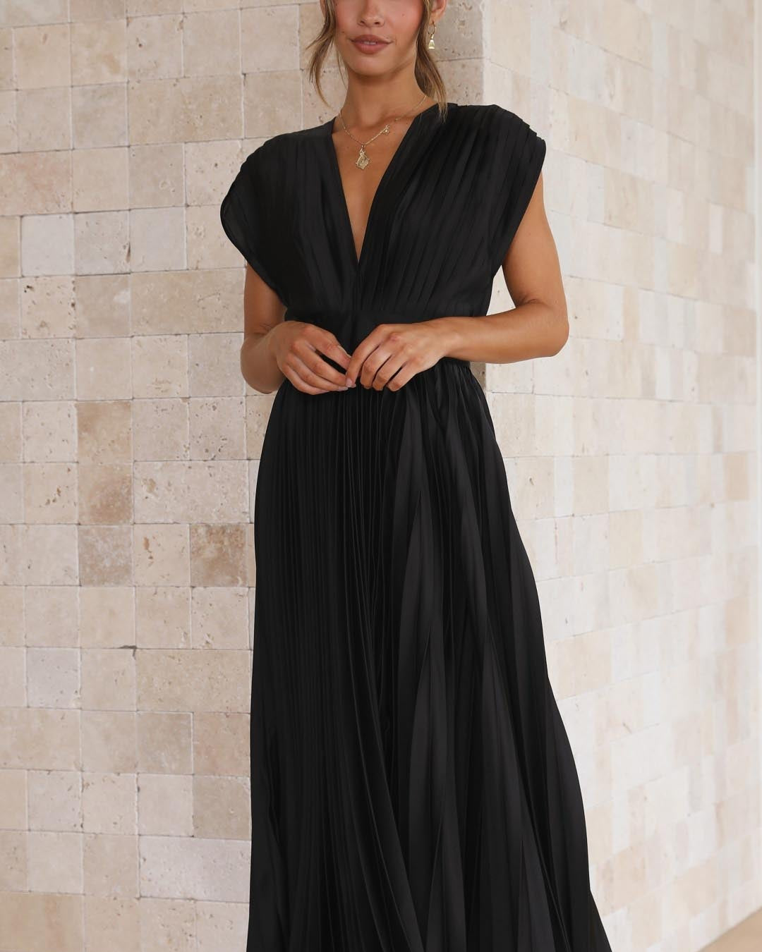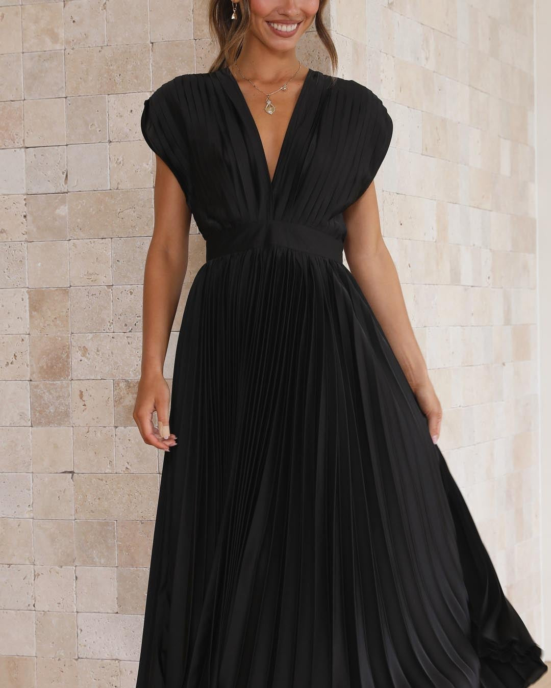 - Élégance intemporelle – Le décolleté en V raffiné et les plis fluides créent une allure classique et sophistiquée.