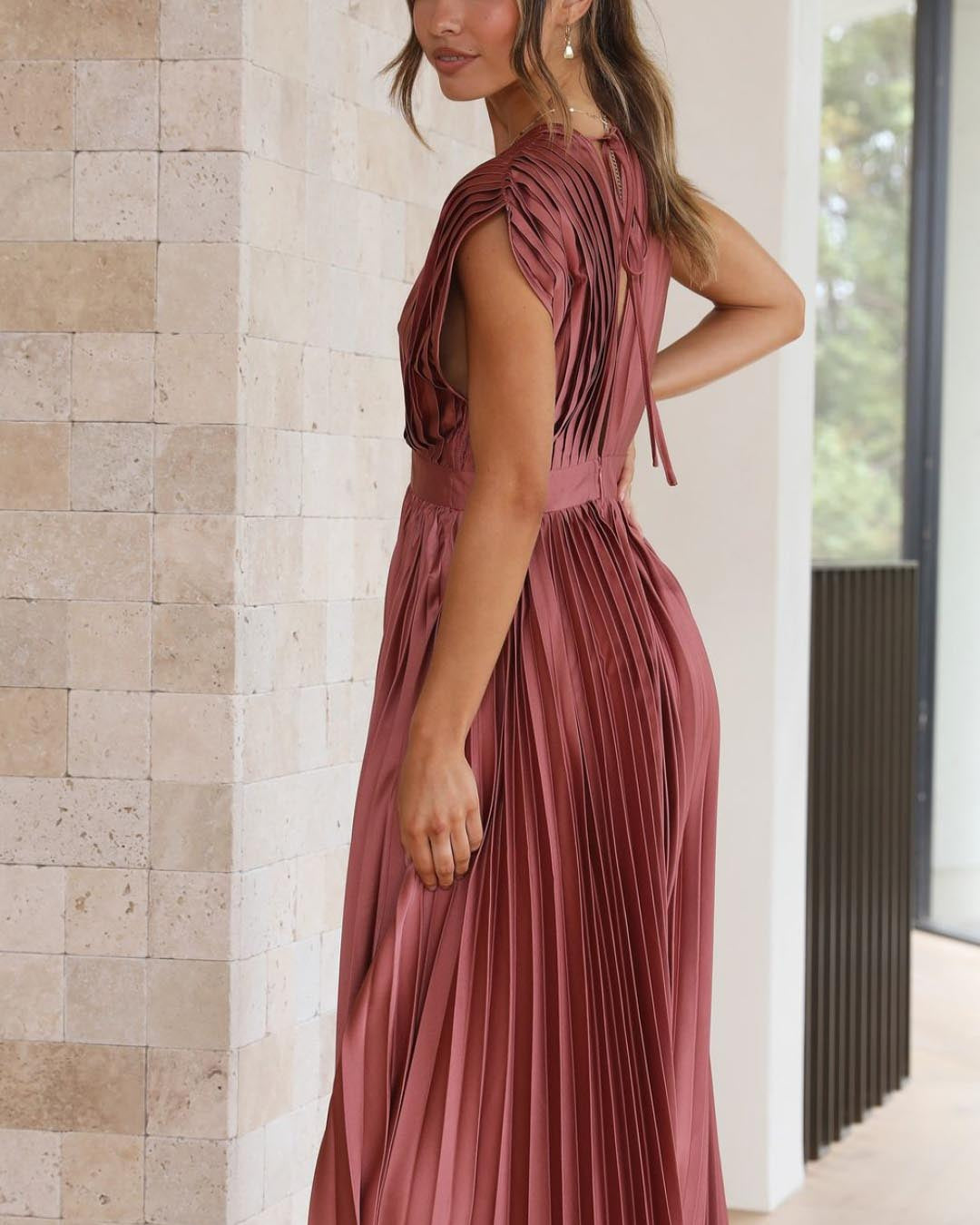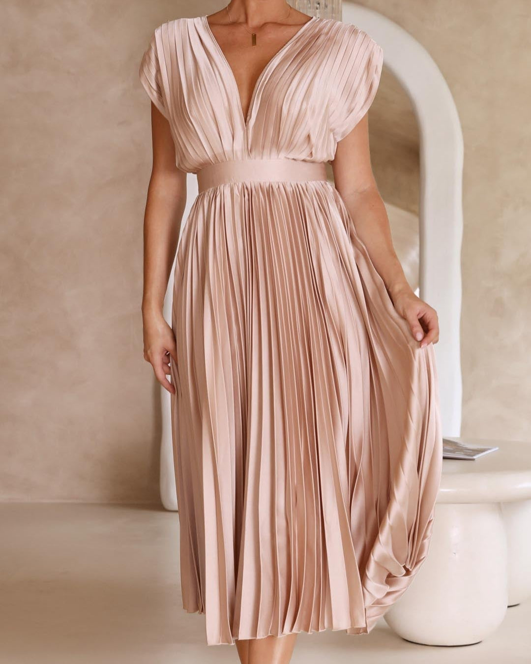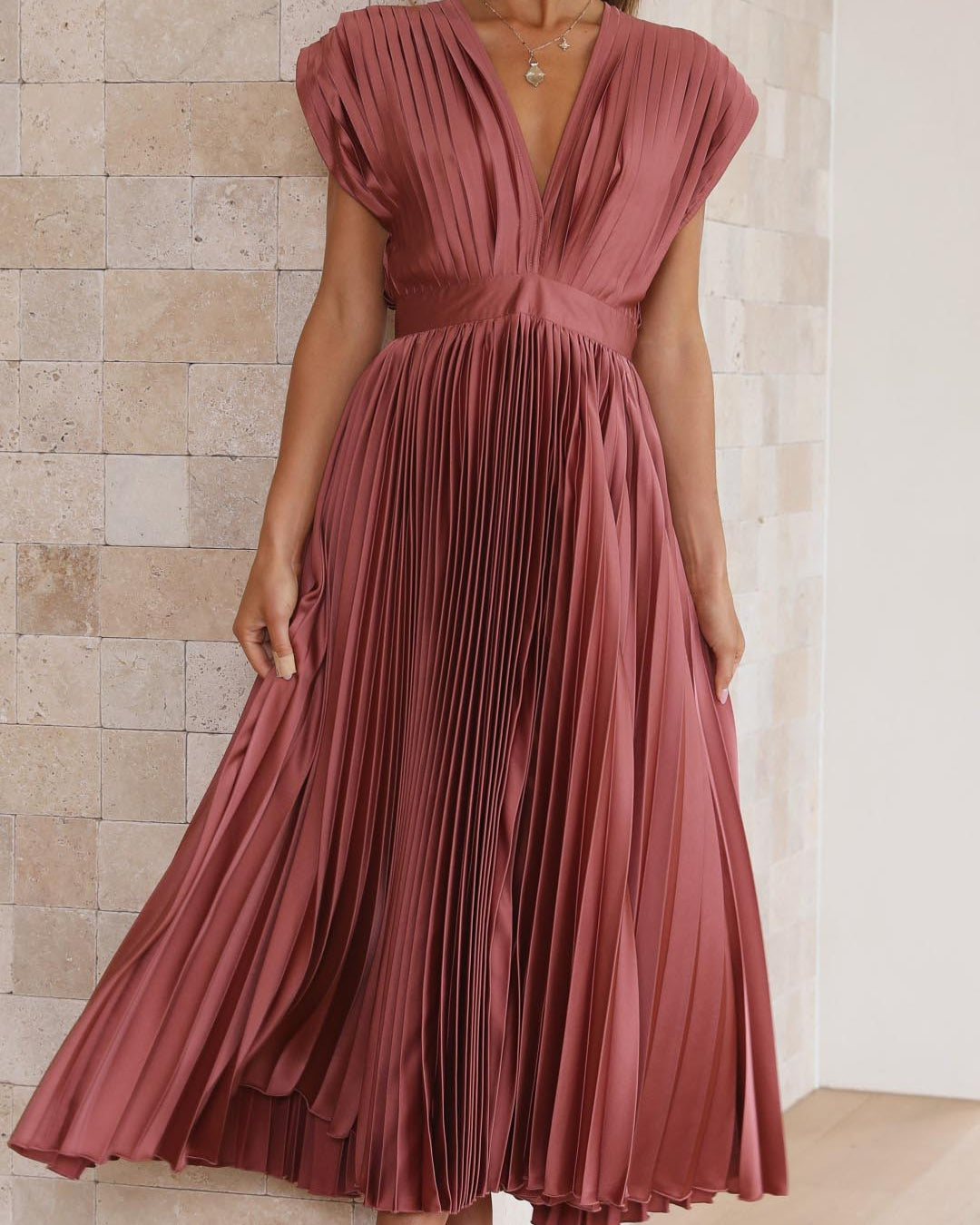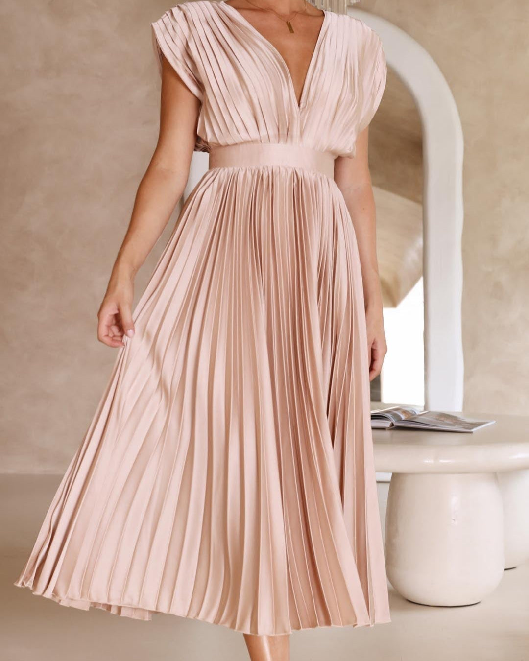 Ce modèle magnifiquement conçu associe un décolleté en V drapé, une taille haute flatteuse et une jupe plissée évasée, créant ainsi une silhouette gracieuse.