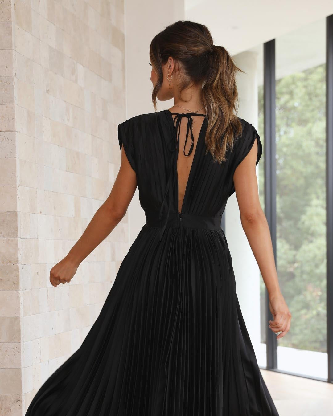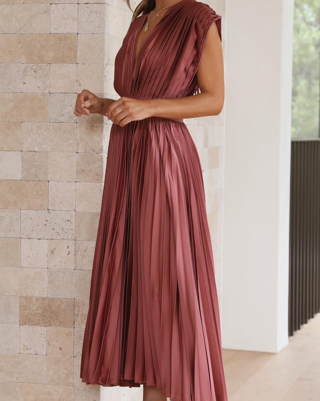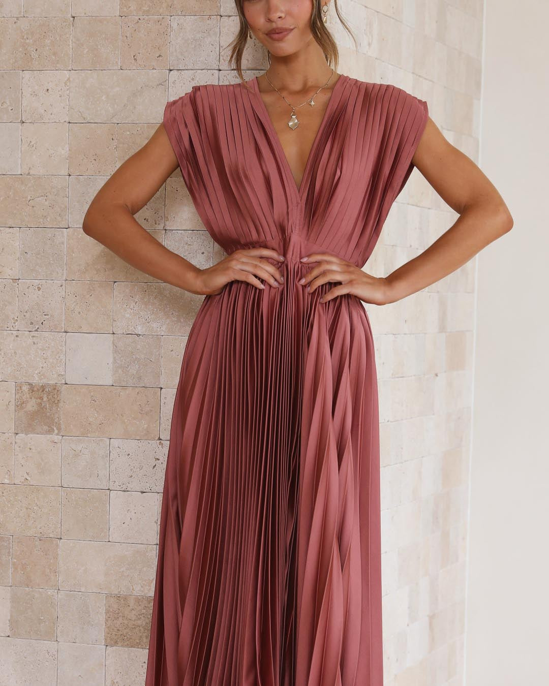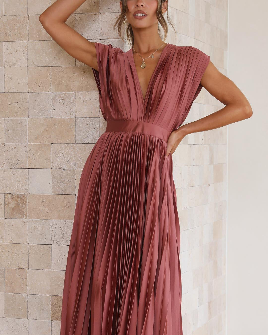 Ce modèle magnifiquement conçu associe un décolleté en V drapé, une taille haute flatteuse et une jupe plissée évasée, créant ainsi une silhouette gracieuse.