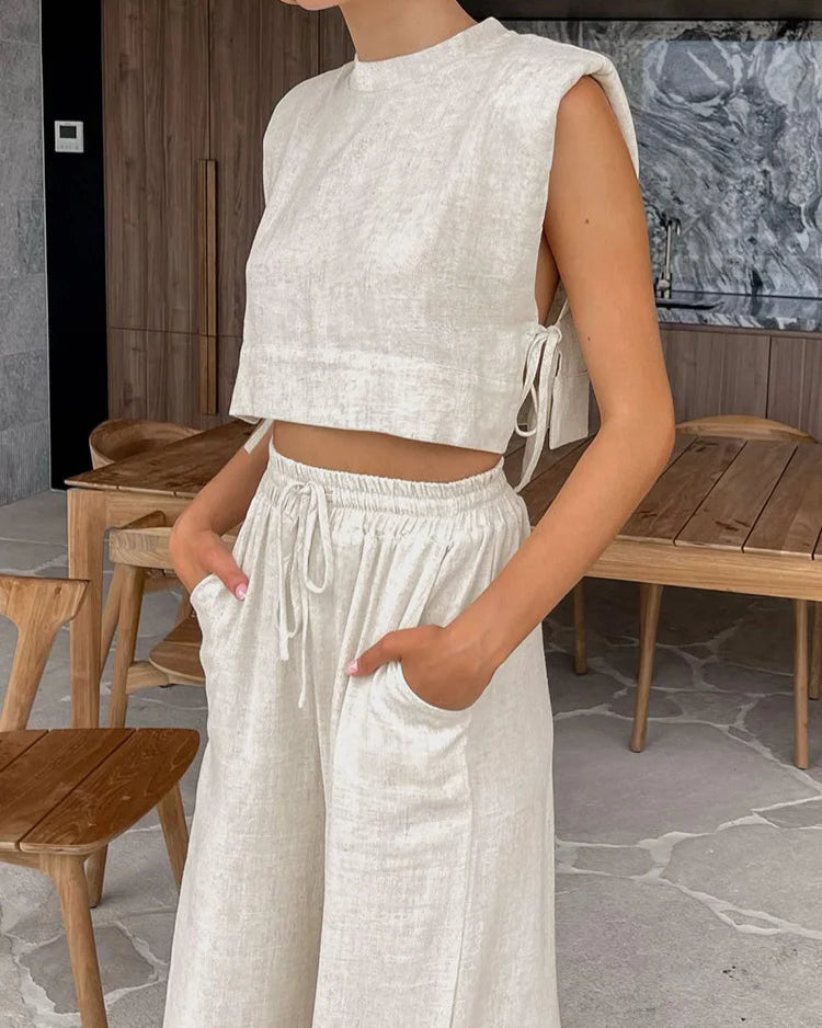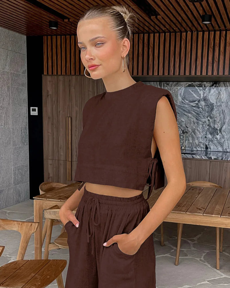 Le haut est subtilement découpé avec de jolis détails comme les liens à nouer sur les côtés, tandis que le pantalon assorti offre une taille haute flatteuse et une coupe fluide ultra-confortable.