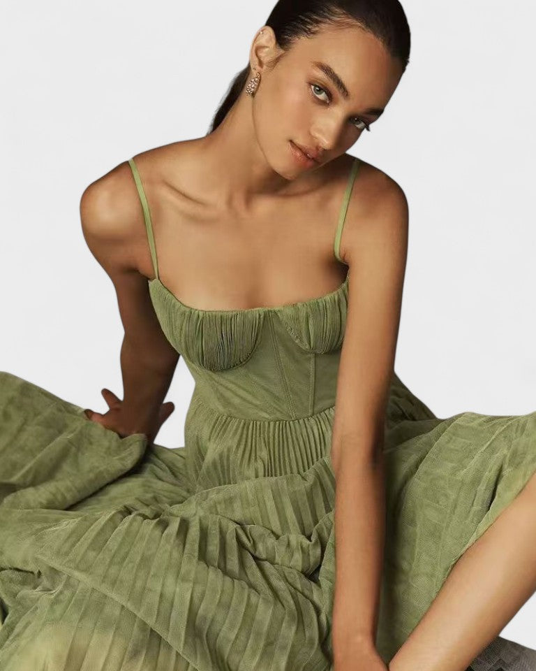 Découvrez l’équilibre parfait entre sophistication et légèreté avec cette robe midi plissée en vert olive. Inspirée par la fluidité des mouvements féminins, ses fines bretelles et son corsage ajusté mettent en valeur la silhouette, tandis que les plis délicats apportent une touche aérienne à chaque mouvement. Idéale pour les occasions spéciales ou pour sublimer le quotidien, cette robe vous accompagne avec grâce et personnalité où que vous alliez.